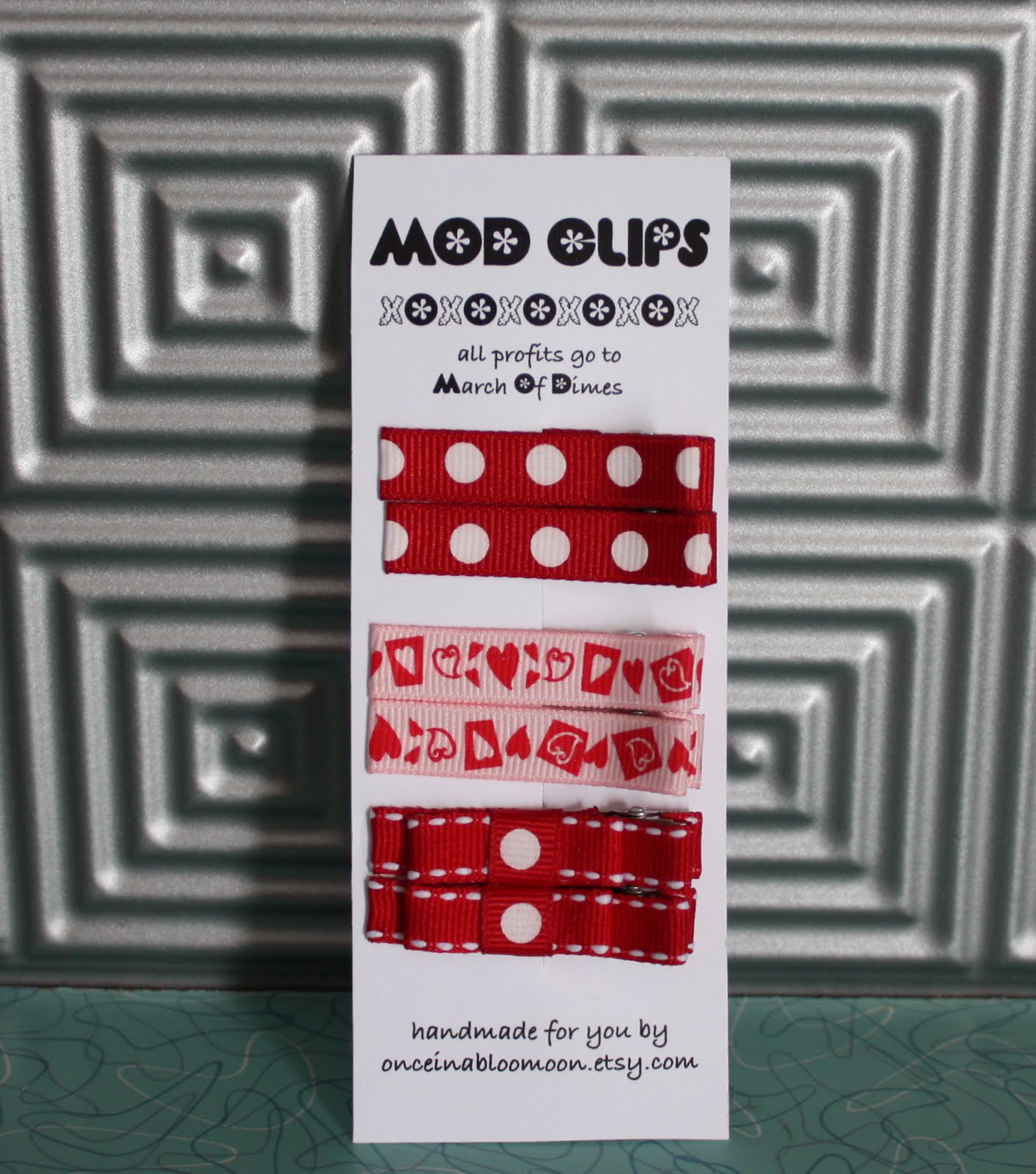 One of the things I am doing to raise money for the March For Babies Walk this year is to donate all the proceeds from one of my etsy products to March of Dimes. I am making cute hair clip sets and calling the MOD CLIPS (March of Dimes=MOD). There are many color combinations to choose from. Won't you come check them out? Click on my etsy link in the side bar.